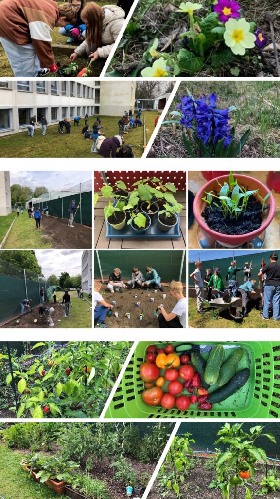 Damit alles wächst, gibt’s Technikhilfe: Ein vom Förderverein gesponsertes Bewässerungssystem mit Computer steuert sechs Rasensprenger durch den Sommer. Ein Komposthaufen wandelt Küchenreste in neue Erde, erste Ernten sind dokumentiert – auch wenn ein Sturm dem Tomaten-Gewächshaus zugesetzt hat. Nächstes Schuljahr steht Ausbau an: bepflanzter Sonnenschirm, Hochbeet, Igelhaus, Insektenhotel, Vogelhäuschen und das Upcycling einer alten Badewanne als Beet. Nachhaltigkeit zum Anfassen – von der ersten Zwiebel bis zum letzten Kürbis.