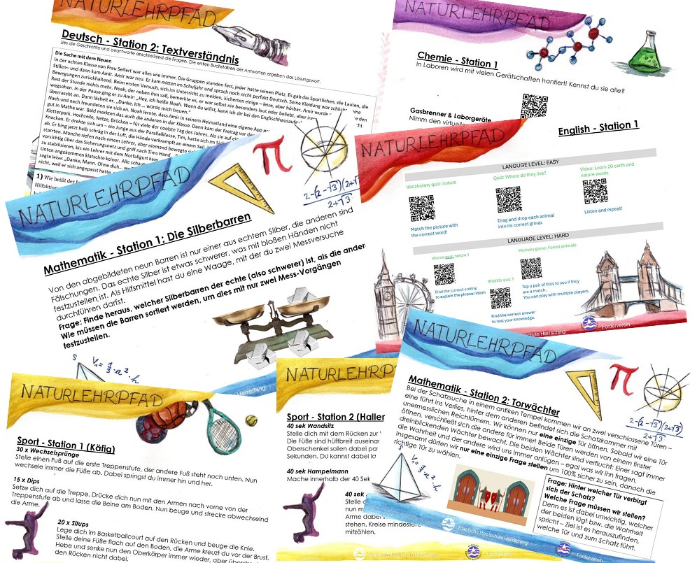 Der Lehrpfad kombiniert digitale und analoge Aufgaben aus vielen Fächern: Chemie-Experimente, biologische Erkenntnisse, Deutsch- und Mathematikrätsel, sportliche Übungen sowie Elemente aus dem Game-Design-Projekt und Knobelaufgaben wie die Da-Vinci-Holzbrücke. Die farbenfrohen, fachbezogenen Hintergrundillustrationen aller Tafeln stammen von der Zehntklässlerin Paloma Spengler.